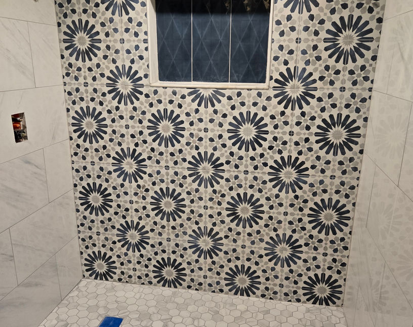 This customer wanted to add built-in shelves and fresh tile into a shower, and reinstall bathroom flooring with a wood design. We remodeled the shower wall and leveled the shower base before installing modern porcelain tile to brighten the space.